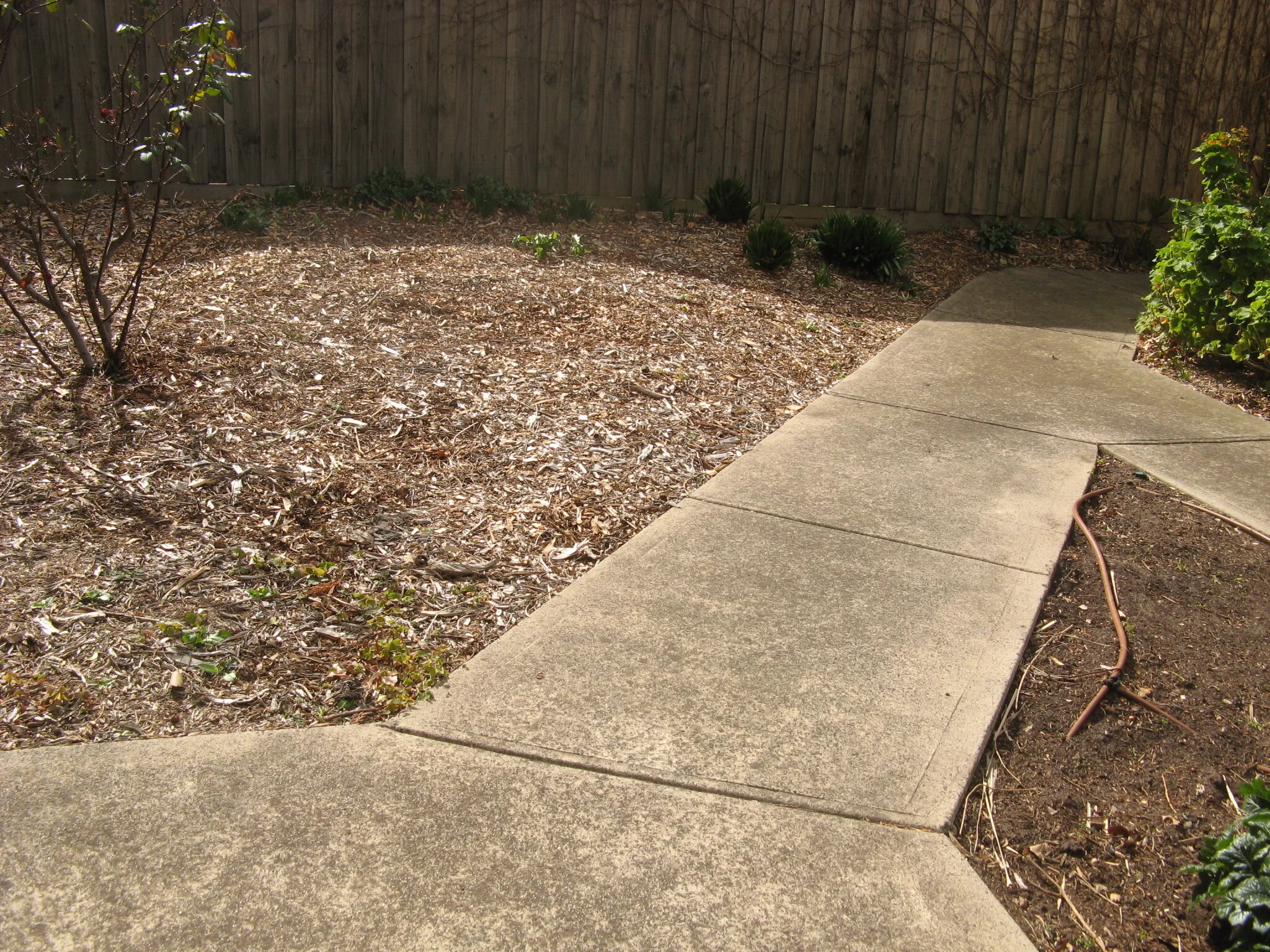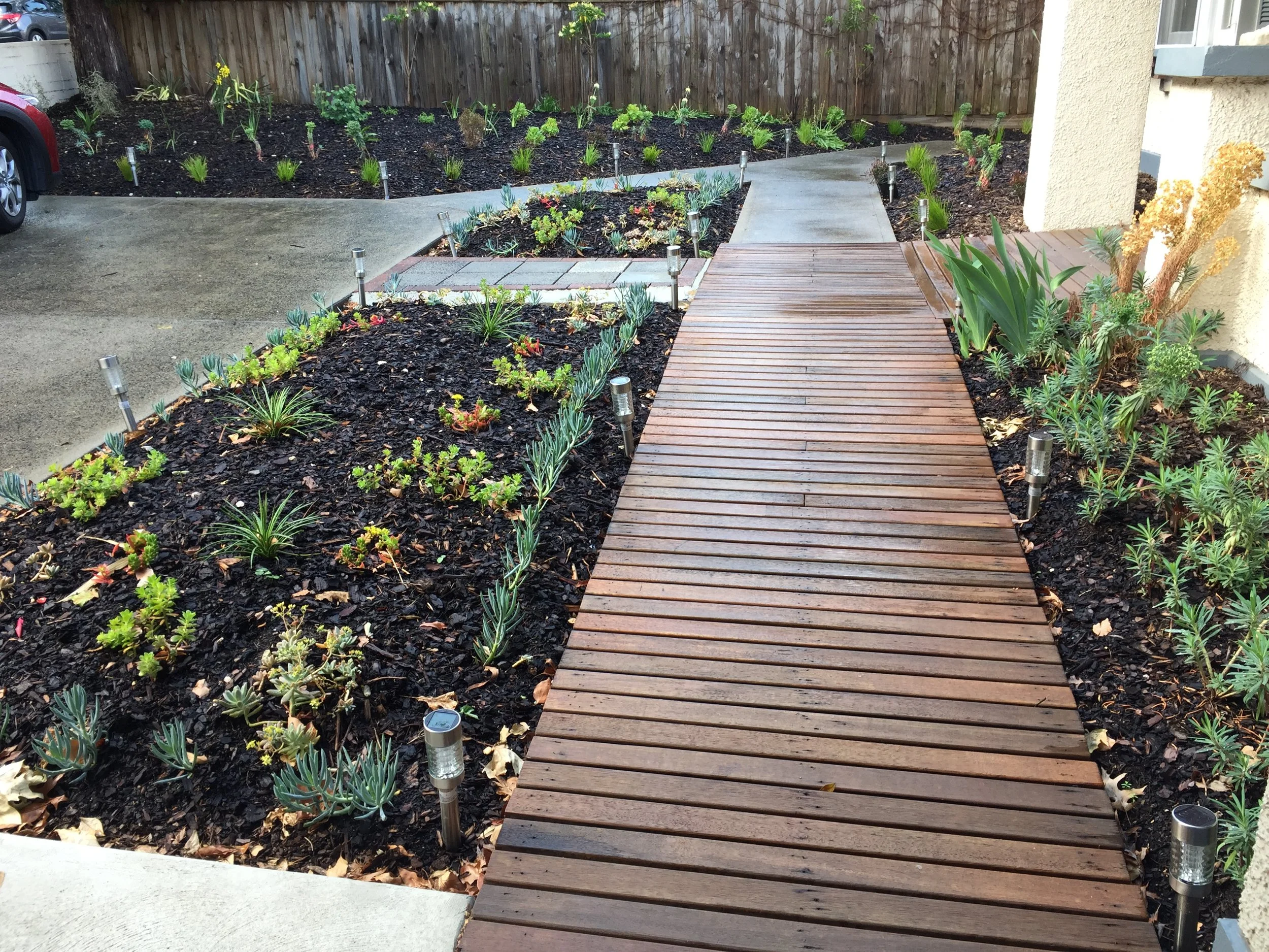 An existing broken 17-year-old irrigation system was ripped out and a new system designed and installed to water the garden on an automatic timer while plants were establishing, especially trees that formed the property perimeter, defining and providing structure to the garden. After plant establishment, this would be turned off.