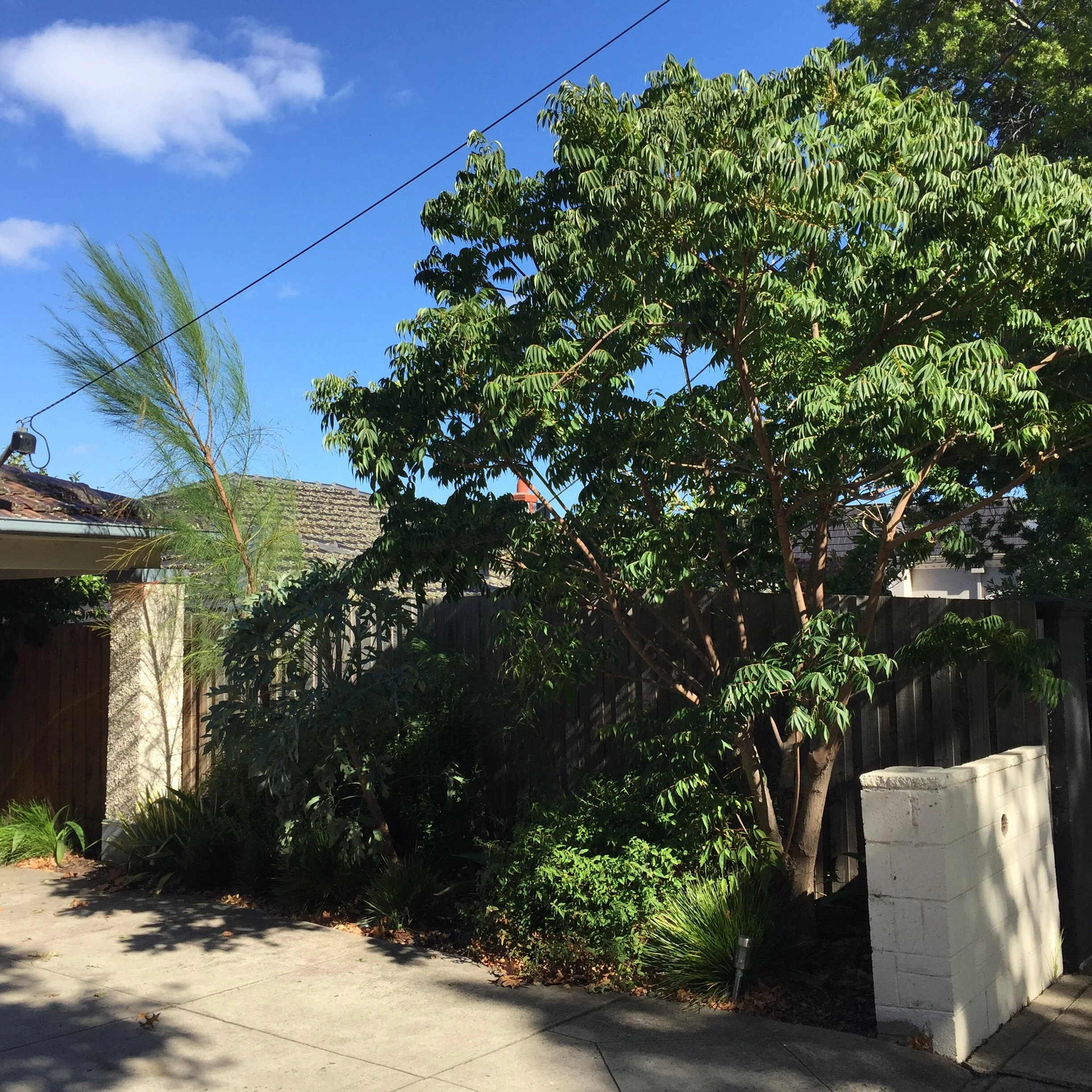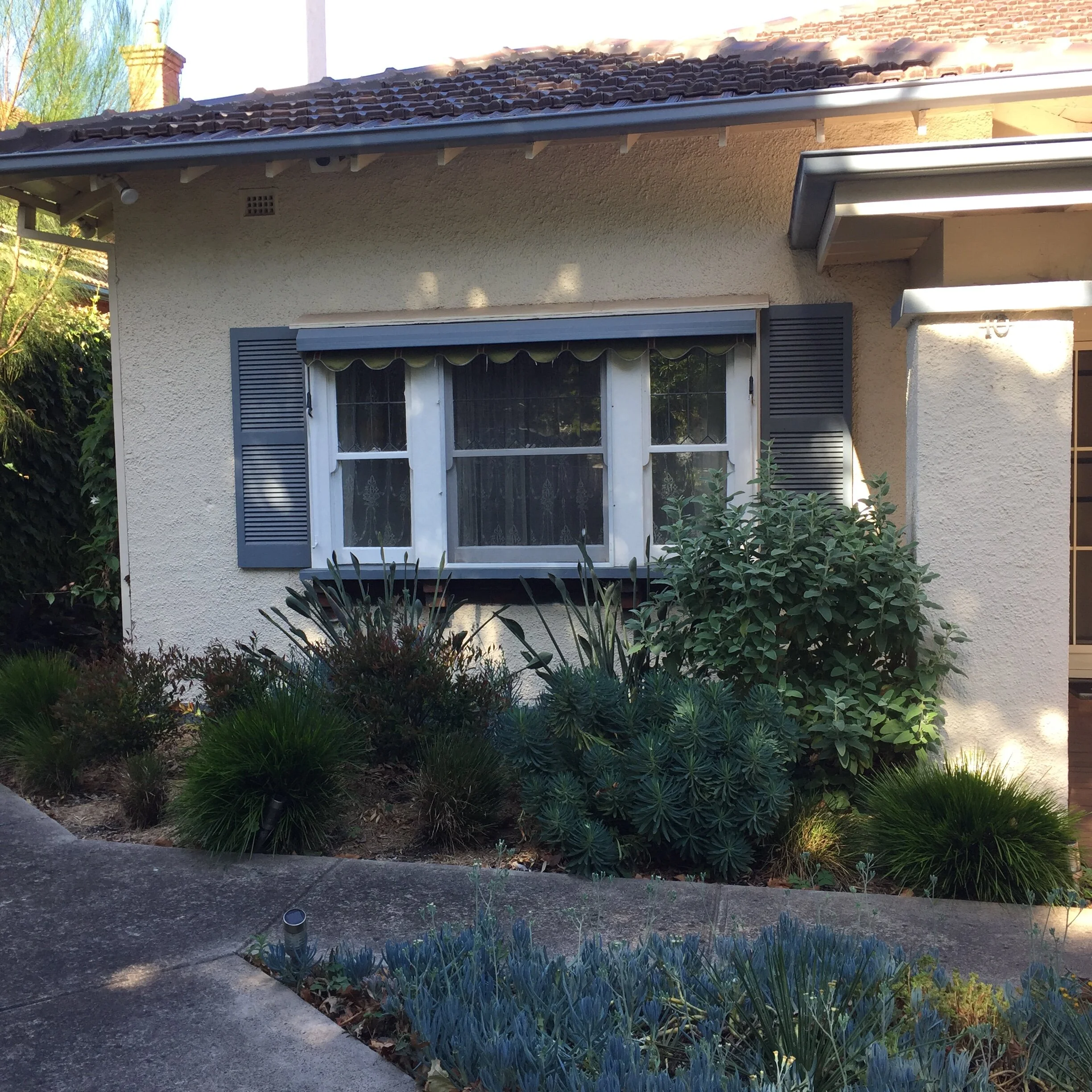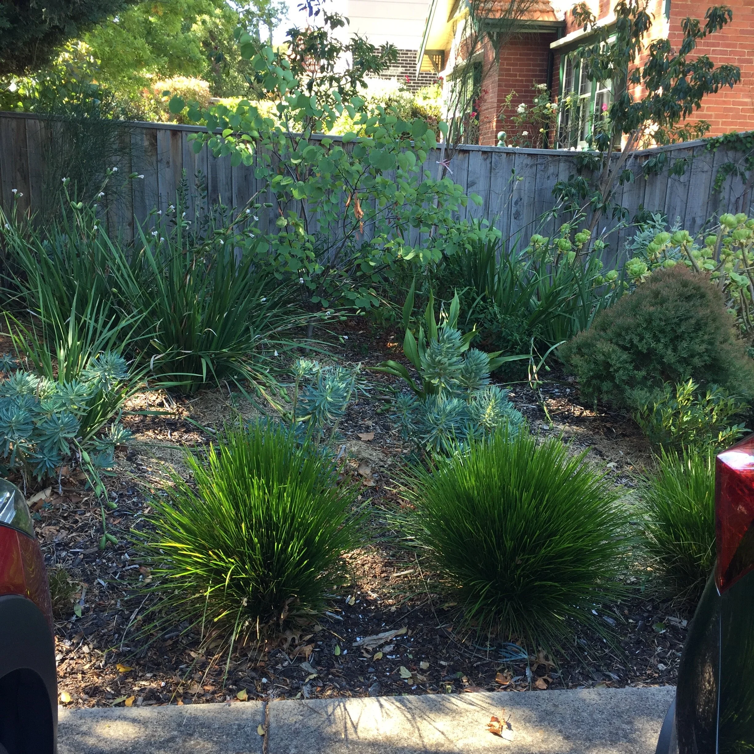 The clients wanted their barren site to be transformed into a garden within the existing layout. With their extended family, they were keen to retain their extensive car parking and use only the existing garden beds. While the couple admitted to having previous interest in gardens, they wanted a garden that was green year-round, full of flower, colour and interest, that was low maintenance and that would survive without irrigation once it was established. Oh, they also wanted no stray leaves on their footpaths.
