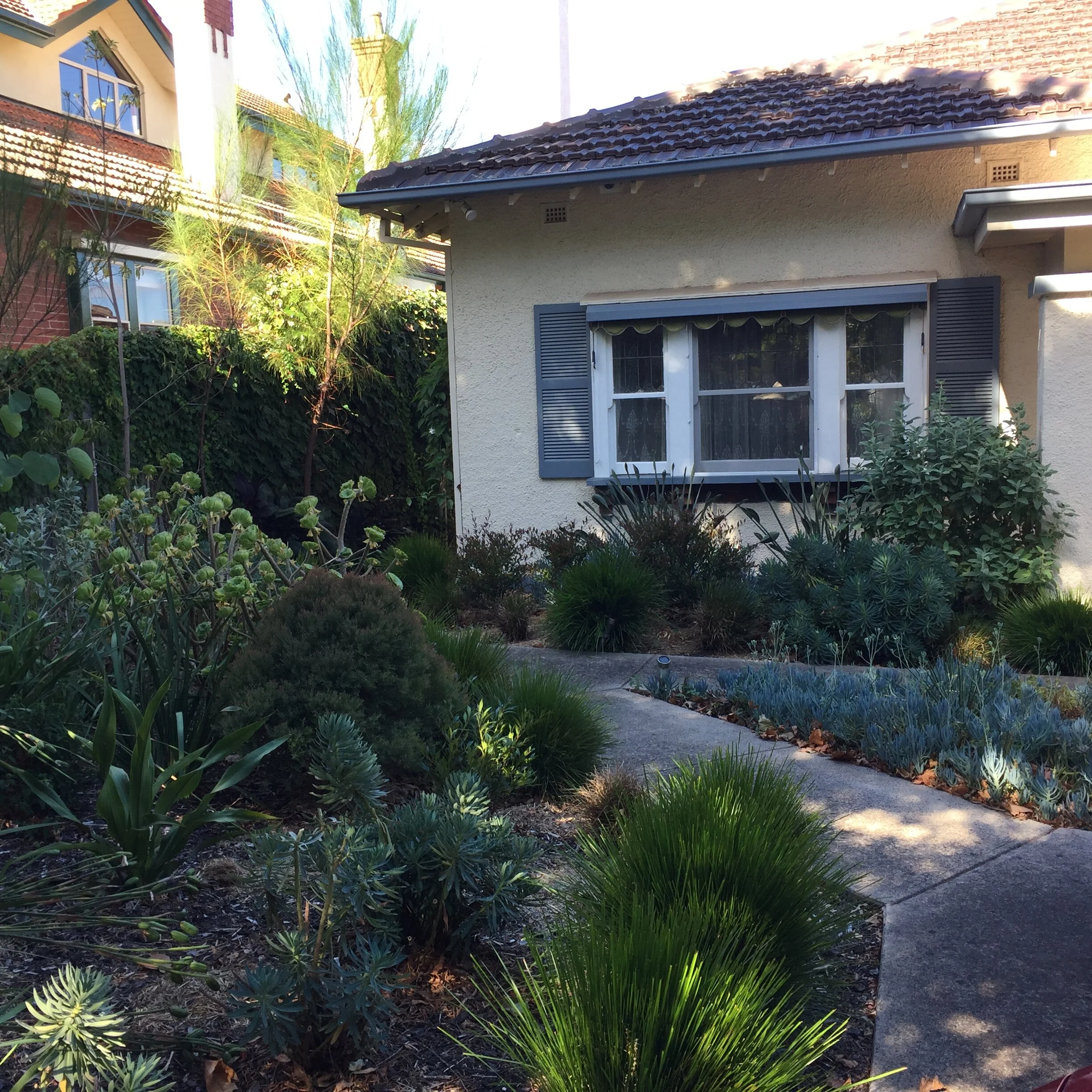 The neglected front garden was transformed into a rich green tapestry full of colour, texture and forms creating a resilient dry garden full of year-round interest.
